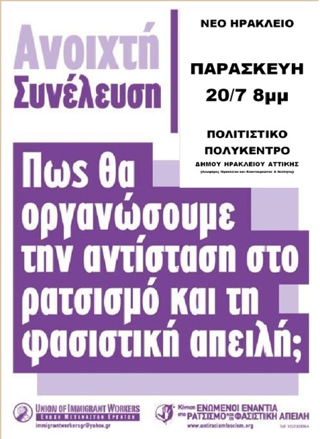 Η Κίνηση Ενωμένοι Ενάντια στο Ρατσισμό και τη Φασιστική Απειλή και η Ένωση Μεταναστών Εργατών, οργανώνουν ανοιχτές αντιφασιστικές συνελεύσεις σε Ν.Ιωνία και Ν.Ηράκλειο, προκειμένου να συζητήσουμε και να οργανώσουμε την αντίσταση στο ρατσισμό και τη φασιστική απειλή. Η συνέλευση του Ηρακλείου θα πραγματοποιηθεί την Παρασκευή 20/7, στις 8μμ στο Πολιτιστικό Πολύκεντρο Δήμου Ηρακλείου Αττικής (Λ.Ηρακλείου και Κουντουριώτου & Νεότητος). Τη συνέλευση θα ανοίξουν με σύντομες παρεμβάσεις εκ μέρους της ΚΕΕΡΦΑ ο Γιώργος Ράγκος, η συνδικαλίστρια τραπεζοϋπαλληλος Εμυ Τζίβα κι ο γνωστός δημοσιογράφος αλβανικής καταγωγής Νίκο Άγκο.